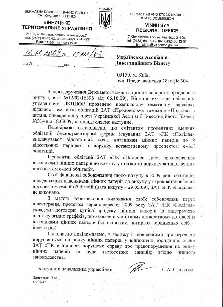 Результат перевірки Вінницького територіального управління ДКЦПФР емітента облігацій ЗАТ "Продовольча компанія "Поділля"