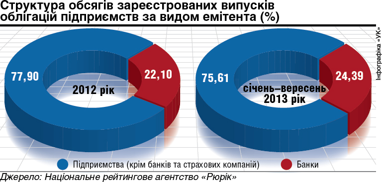 Емісію облігацій на загальну суму 6,34 мільярда гривень здійснили у січні-вересні 2013 року банки, тоді як страхові компанії не зробили жодного випуску облігацій. «Найбільш питому вагу в загальному обсязі облігацій посідають облігаційні випуски підприємств. Таким чином, тенденція останніх 10 років зберігається», — підкреслюється в аналітичному огляді РА «Рюрик».