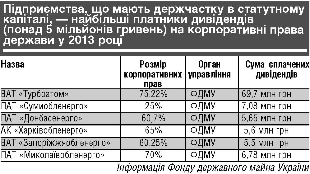 За інформацією Фонду державного майна України (ФДМУ), за 2011 рік надходження дивідендів до державного бюджету від 101 підприємства з держчасткою становили понад 588,1 мільйона гривень, від 118 підприємств за 2012-й — 575 мільйонів гривень. Минулого року ФДМУ обраховував дивіденди, які сплатили 68 підприємств, що перебувають виключно у його управлінні: сума перерахованих дивідендів на державні корпоративні права становить 125,16 мільйона гривень.