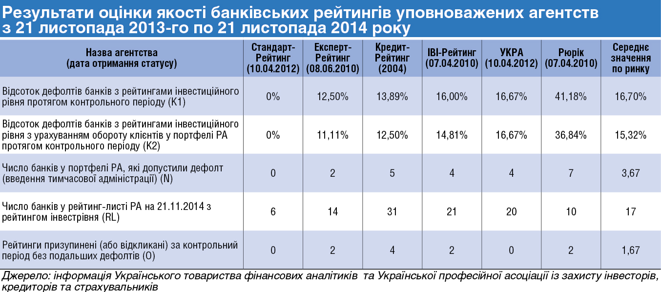 Інвестор, що розмістив грошові кошти в 36—40 банках з рейтингами інвестрівня цього агентства, протягом контрольного періоду втратив би тільки 13,89 гривні з кожних 100 розміщених. Це краще середнього відсотка дефолтів у клієнтському портфелі РА по ринку. Кращий за середній по ринку результат показали також РА «IBI-Рейтинг» та УКРА. А НРА «Рюрік» виконувало свою функцію на рівні, близькому до критичної позначки.