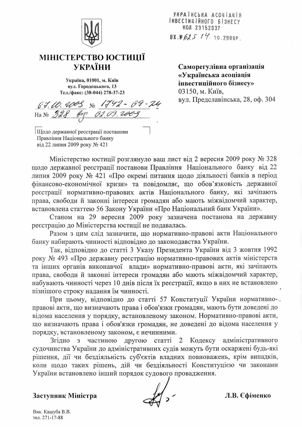 - Відповідь Міністерства юстиції України на запит УАІБ щодо законності постанови НБУ № 42115.10.2009